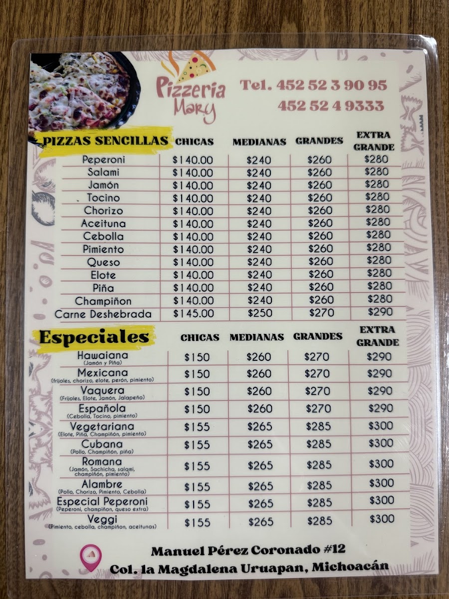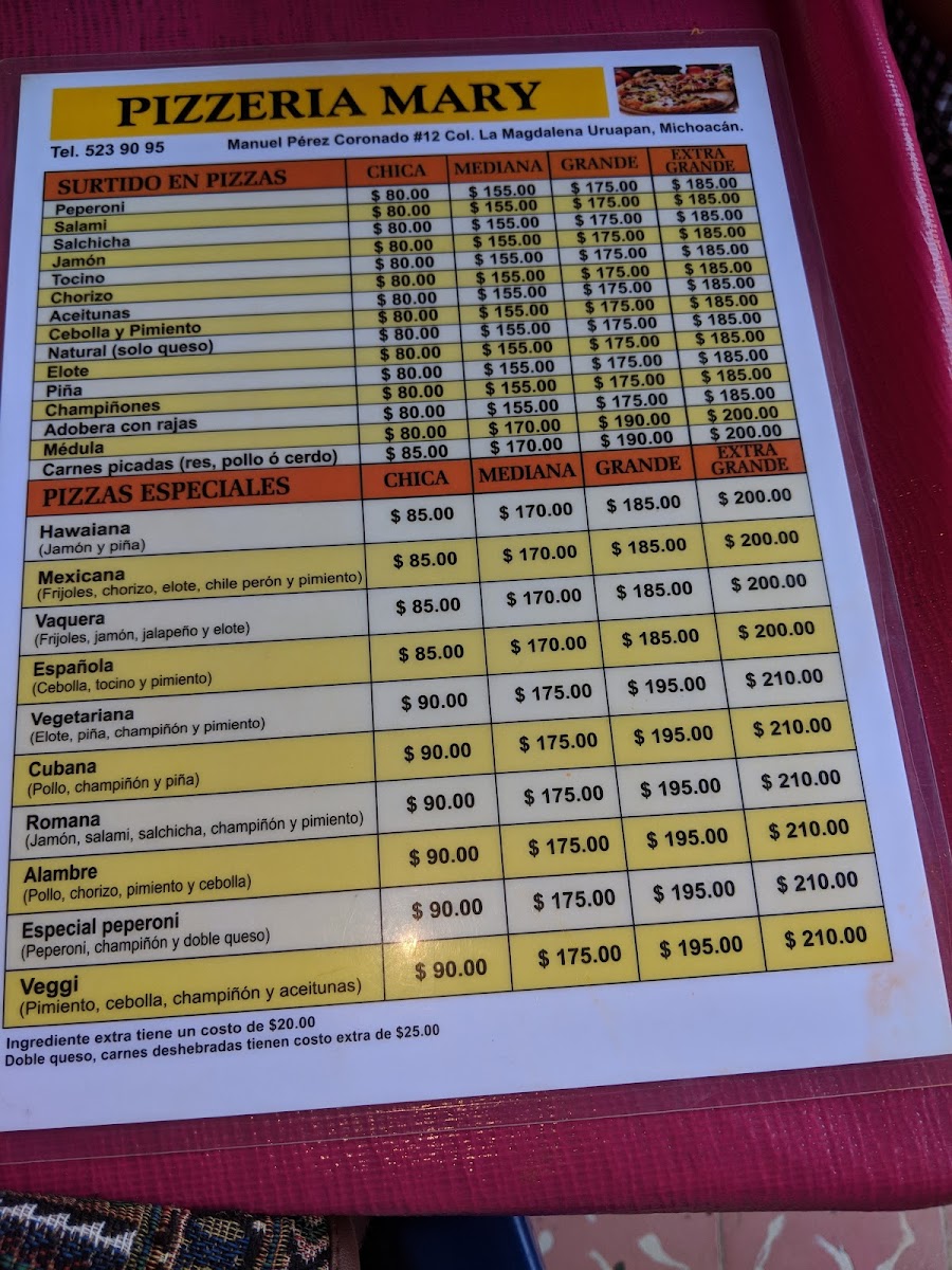 Welcome to Pizzeria Mary, a culinary gem nestled in the heart of Uruapan, Mexico. This establishment is celebrated for its exceptional flavors, particularly in their pizza offerings, which are infused with a unique traditional twist. Guests rave about the bone marrow toasts and delicious sopes, both of which reflect the kitchen's commitment to quality and taste.